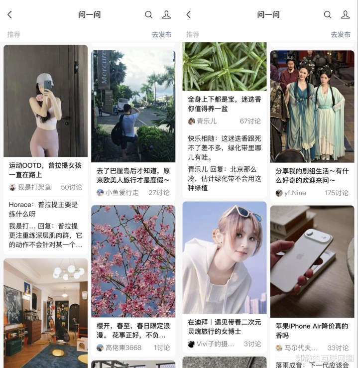 比如,微信“问一问”的Feed流展示,若是你同期掀开微信“问一问”和小红书,在莫得名字的情况下,很有可能把两者搞污染。天然这种图文呈现双列展示的神情并非小红书私有,但它在这方面的“标签”贴得最牢,从内容的展示神情来看,微信“问一问”也学小红书模式,可问题在于,会灵验吗?